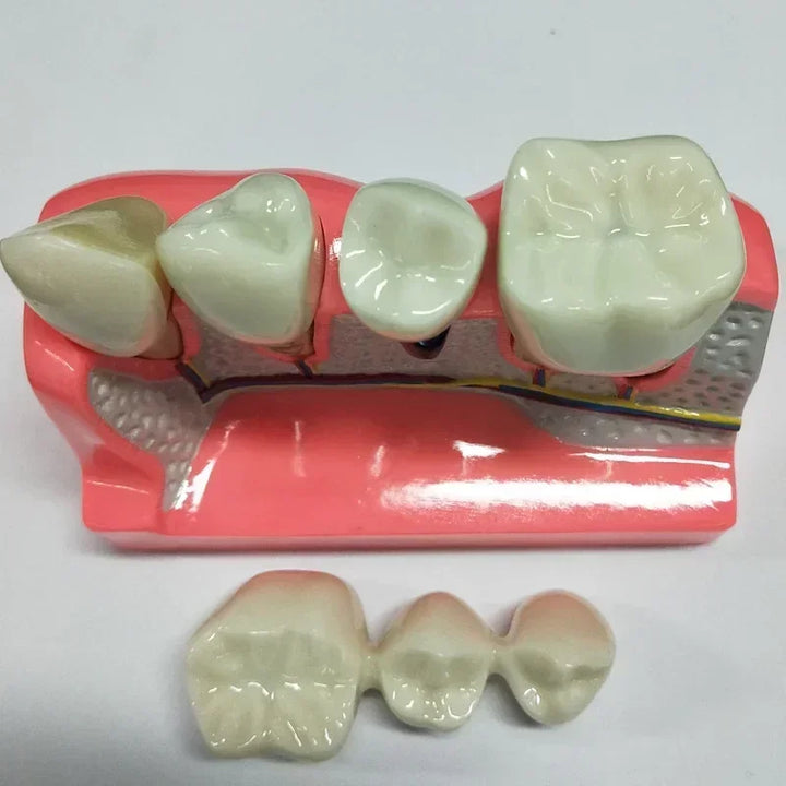 Com esse modelo contém 4 dentes e você vai conseguir demostrar como funciona: uma prótese fixa unitária, uma prótese fixa múltipla, como o dente fica após o preparo dentário, um implante unitário com pilar e prótese fixa cimentada, um dente com faceta (lente dental).